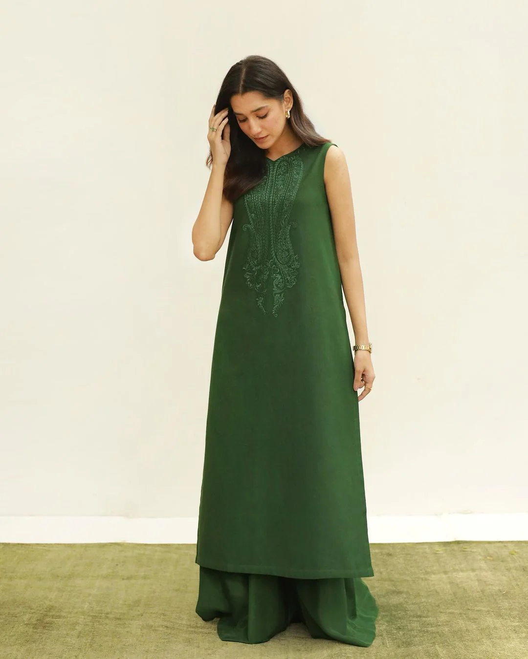 Look stylish and graceful in this bottle green Khaddar dress with delicate embroidery details. This dress is perfect for any special occasion, featuring a lightweight fabric for all-day comfort. Perfect for summer days, this eye-catching dress is sure to leave a lasting impression.