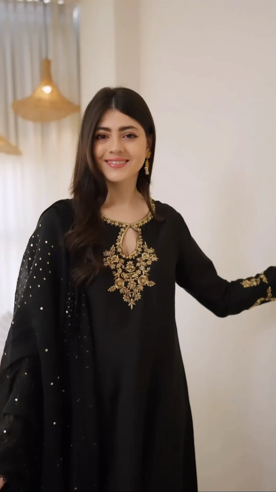 This beautiful three piece is designed on emerald pure silk 58 Gms with intricate detailed gold hand/ada work, styled with a embellished dupatta featuring wild floral motifs. An head turner design for your festive events.
