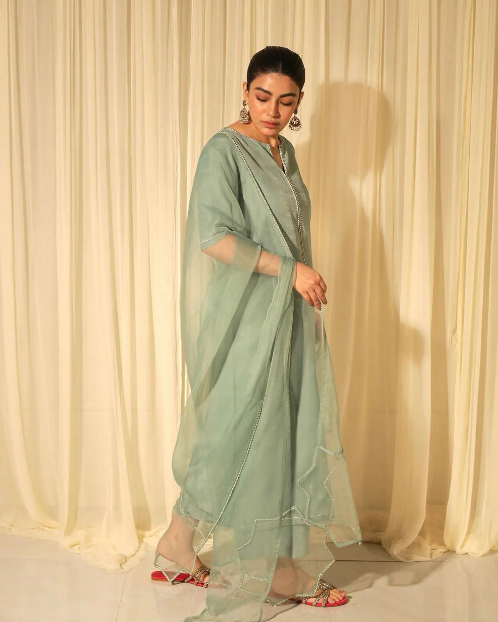 Discover ELIZA, a 3 piece ready-to-wear set featuring a handmade front neck, sleeves crafted from luxurious chermouse silk fabric and an exquisite handmade organza dupatta. Perfect for special occasions, this set exudes elegance and style.