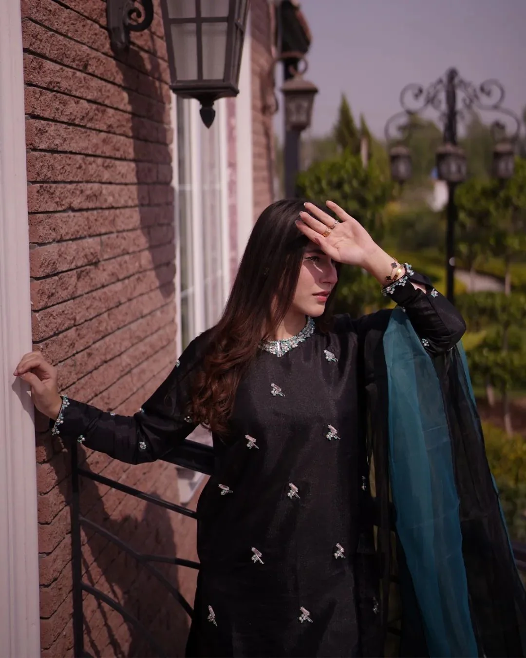 ICE BLACK is a 3-piece hand-made dress composed of luxurious Organza Dupatta fabric and intricate stitching. It offers a timeless classic look that makes a bold statement. Its design is sure to make any woman feel beautiful and elegant.